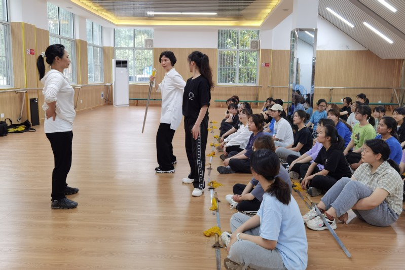 讲解后,范老师在太极剑教学方面,为学生进行了指导,帮助学生改正动作的不规范之处,点明动作的要领,并亲身示范以教授学生正确的练习方法。