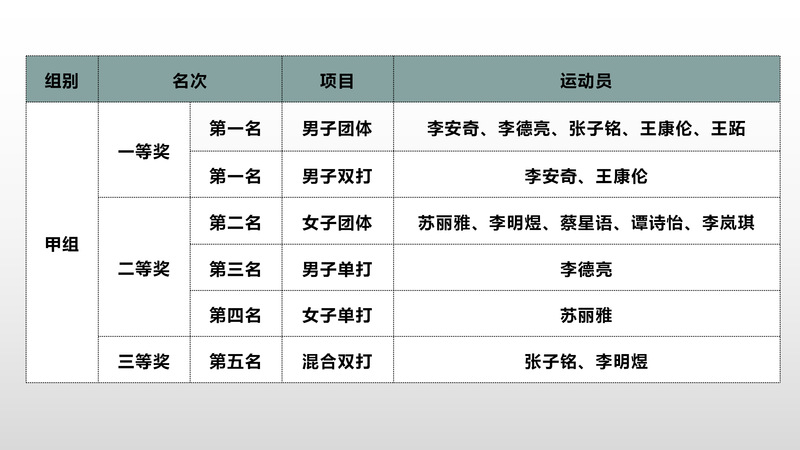 在单项比赛中,我校男双(李安奇/王康伦)稳定发挥,以前场快速连贯和后场有力下压控制的绝对优势摘得桂冠。男子单打(李德亮)经验丰富,稳扎稳打摘得一枚铜牌。女子单打(苏丽雅)球球必争,奋力拼搏,最终取得第四名的优异成绩。女双选手(蔡星语/谭诗怡)不畏强敌,奋勇拼搏小组赛以2:1的微弱劣势惜败此次大赛冠军。混合双打(张子铭/李明煜,王跖/李岚琪)均发挥出色,经过激烈角逐,王跖/李岚琪跻身16强,张子铭/李明煜取得第五名的佳绩。