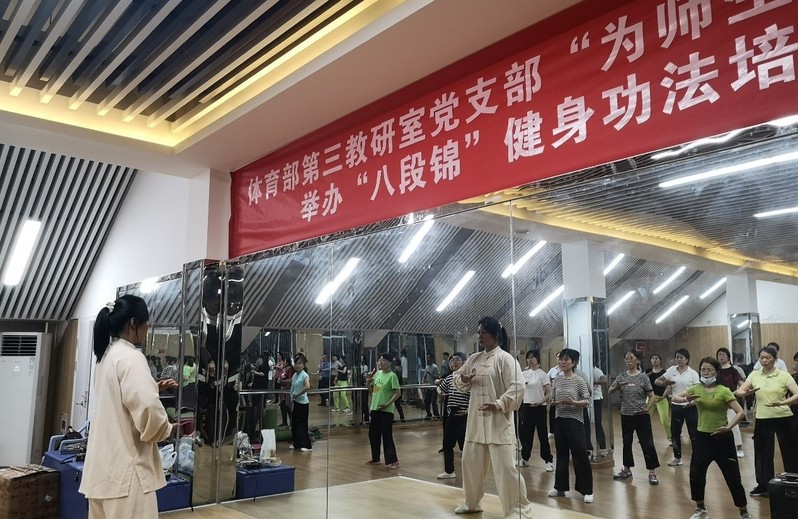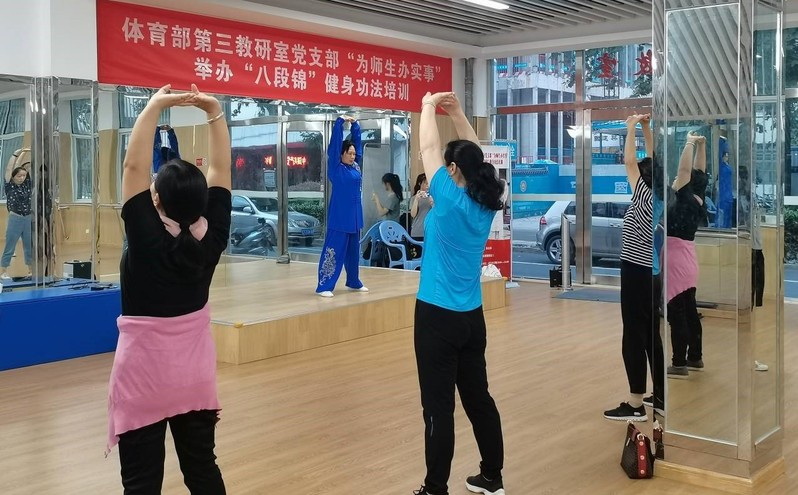 为扎实开展“我为师生办实事”实践活动,贯彻落实习近平总书记在党史学习教育动员大会上“学史明理、学史增信、学史崇德、学史力行”要求,发挥必赢3003no1专业特长优势和党员教师的先锋模范作用,为提高我校教职员工健康水平做贡献。2021年6月16日——6月30日,由校必赢3003no1和工会主办,必赢3003no1第三教研室党支部承办、党员张亚琼老师精心指导,面向全校教职员工开展的健身“八段锦”功法公益培训活动如期开班。
