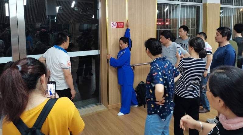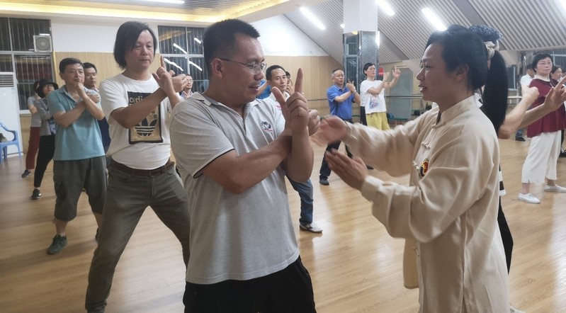 培训开始,在简单的热身活动后,张老师从手势步型开始向大家讲解。“手势包括‘自然掌’‘八字掌’‘龙爪’‘握固’,自然掌的要点是五指自然伸直,稍分开,掌心微含......”张老师通过言传和身教结合,一边讲述要点,一边向大家具体演示,发现教职员工动作不对便走到身前细心纠正,教职员工们也积极提问,教学现场互动气氛十分热烈。
