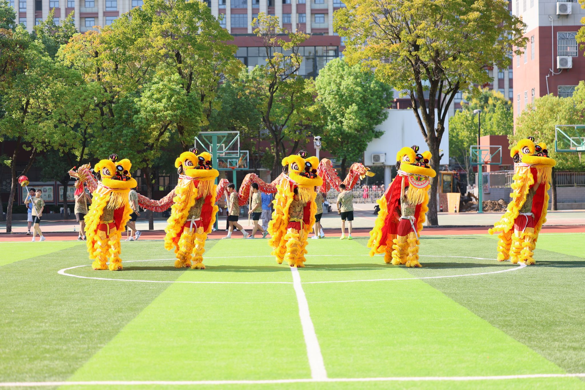 8月17日,团队转赴蚌埠怀远县实验小学教育集团校本部,依托怀远“淮上明珠”的地域底蕴与民俗资源,开展了一场生动的“龙狮文化课堂”。队长以“南狮北狮”“舞龙流派”等文化讲座开启课堂,分组教授舞龙、南狮和彩带龙技巧,并通过“醒狮由来”“柳毅传书”等故事传递文化内涵。8月22日,团队联合学校举办“家长进校园”活动,以“孩子教家长”的创新形式,推动龙狮文化向家庭和社会延伸。